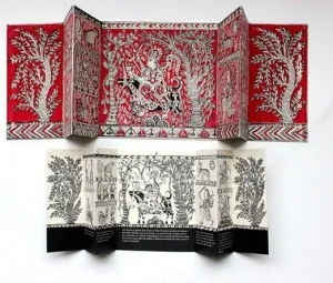This textile book tells the story of the origins of Mata-Ni-Pachedi, the ritual Cloth of the Mother Goddess'. Traditionally created by artisans from the nomadic Vaghari community in Gujarat, these votive cloths offer a painted image of the goddess to herself. Gifting a piece of creation to the creator is considered the highest form of worship. Hand block-printed on textile, this limited-edition artists' book is in the form of a cloth shrine. It pays tribute not only to a sublime conception of the power of art, but also to the labour involved in creating it. Each copy is accompanied by a facsimile paper storyboard, featuring text that takes the reader through the various panels. The new edition provides contextual information printed on a textile cover that unwraps in layers.