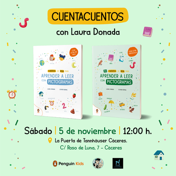 El sábado 29 de octubre a las 12 del mediodía no os perdáis el cuentacuentos de "Cuentos de risa para aprender a leer con pictogramas" con Laura Donada en La Puerta de Tannhäuser de Cáceres. La autora narrará el cuentacuentos de sus dos últimos libros de cuentos de risa para leer y dedicará sus librinos a los peques que así lo deseen. Está deliciosamente ilustrado por Esther Bernal y publicado por Penguin Kids.