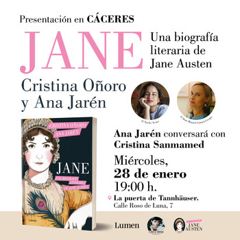 El miércoles 28 de enero a las 19h. la ilustradora y artista Ana Jaren presenta: "Jane, una biografía literaria de Jane Austen" en La Puerta de Tannhäuser de Cáceres. Llega a nuestra librería de la mano de su editorial Lumen para celebrar el 250.º aniversario del nacimiento de Jane Austen.