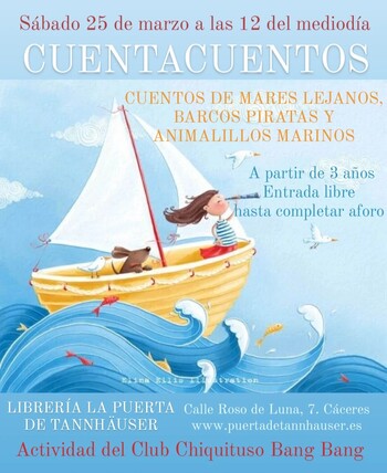 El sábado 25 de marzo a las 12 del mediodía vamos a hacer el primer cuentacuentos sobre historias del mar, islas y piratas del Club Chiquituso Bang Bang en La Pecera de La Puerta de Tannhäuser de Cáceres. Para peques a partir de 3 años.