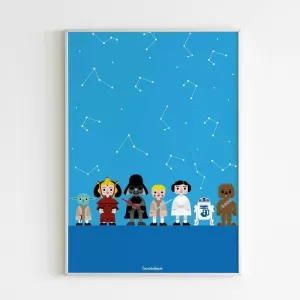 Ilustración de algunos los personajes de la saga Star Wars: Leia, Yoda, Chewbacca, R2-D2, Amidala, Darth Vader...